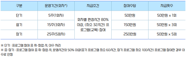 - 중기 프로그램 (15주): 150만원 (회차별 50만원씩, 총 3회 지급, 80% 이상 참여)